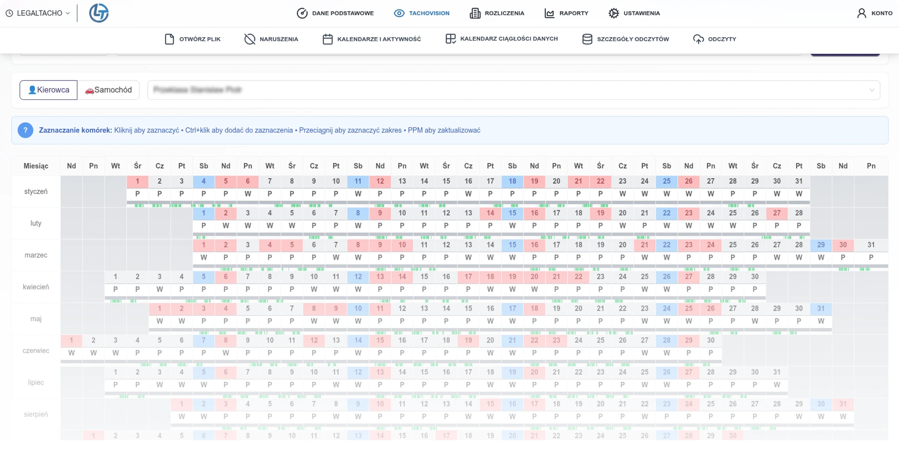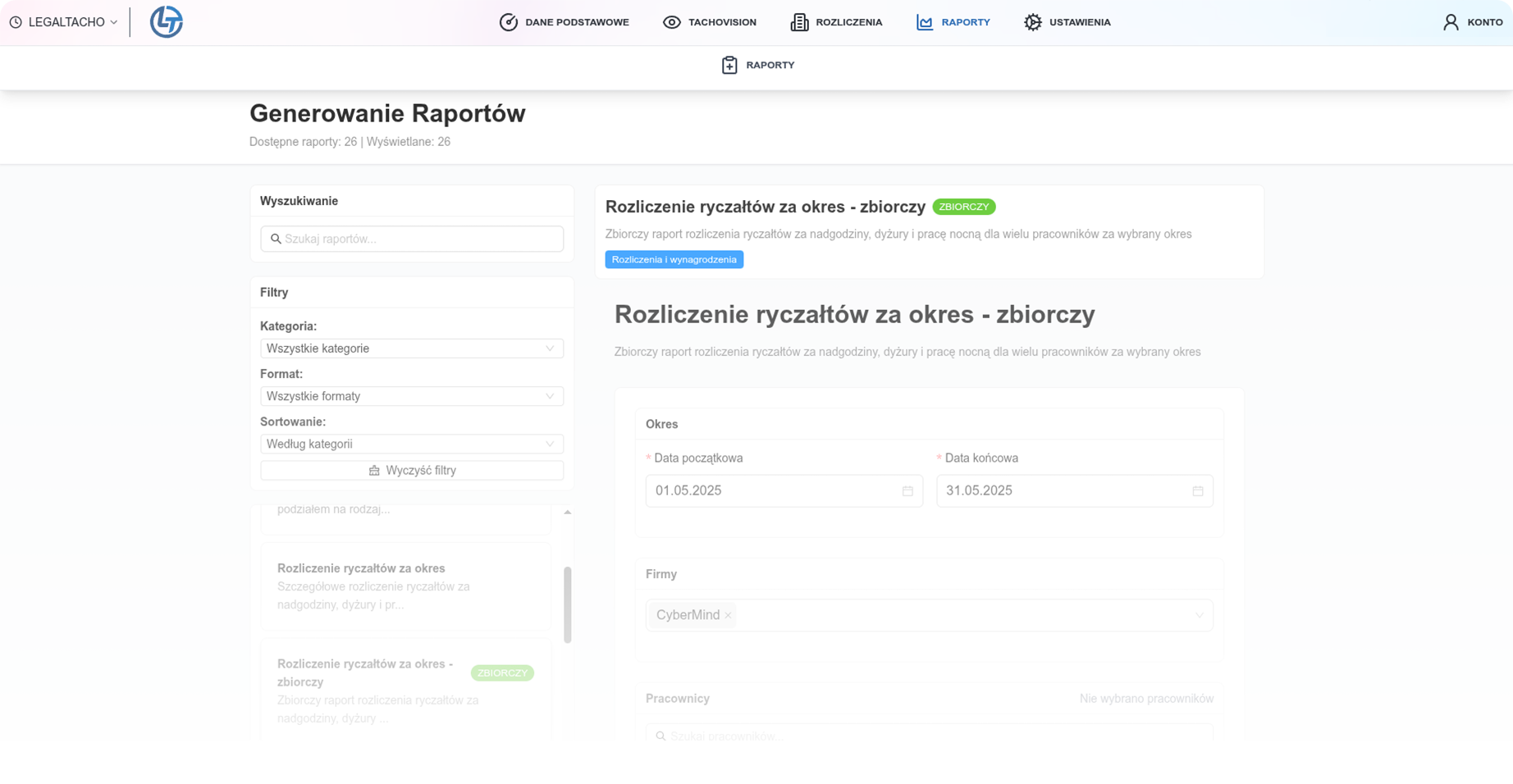 System generuje ewidencję czasu pracy kierowców zgodną z wymaganiami PIP, zestawienia do naliczania wynagrodzeń oraz raporty zarządcze (np. struktura czasu pracy, procentowe udziały aktywności, porównanie kierowców).