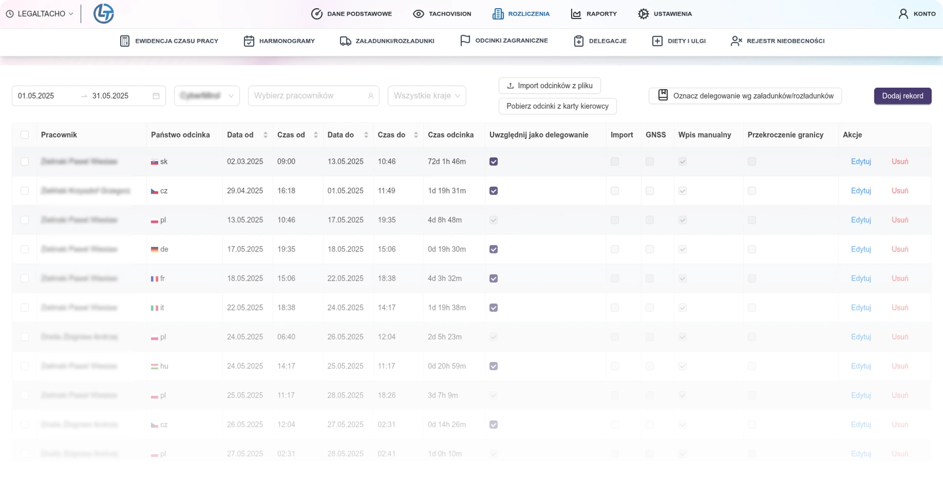 LegalTrans.ai automatycznie rozlicza czas pracy kierowców na podstawie danych z tachografów, kart kierowców, GPS i planu z TMS. System uwzględnia przepisy UE i polskie prawo pracy (dyżury, noce, nadgodziny, święta, podróże służbowe, płace zagraniczne), od razu pokazując naruszenia i ich koszt.