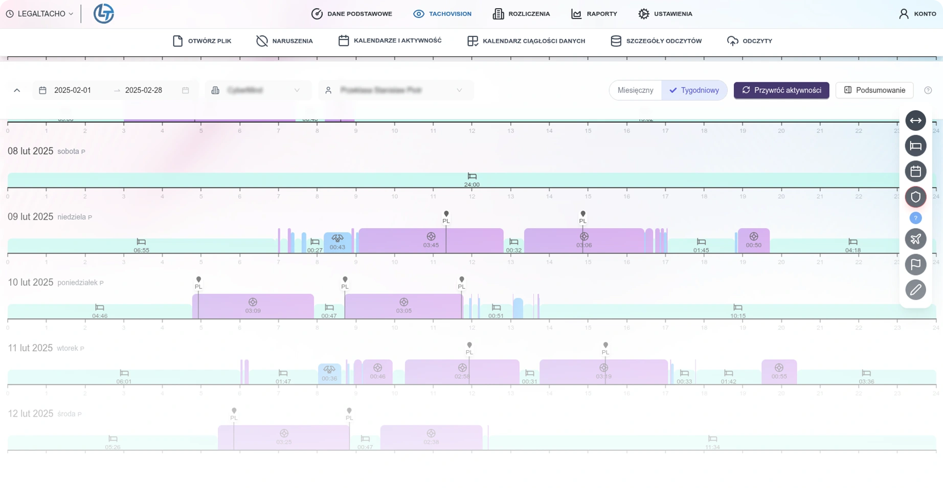System automatycznie pobiera pliki z tachografów i kart kierowców (w tym zdalnie, przez telematykę), weryfikuje ich kompletność oraz spójność z pozycją GPS i planem z TMS. Dzięki temu ewidencja opiera się na pełnych, wiarygodnych danych - bez "dziur" i ręcznego dogrywania plików.