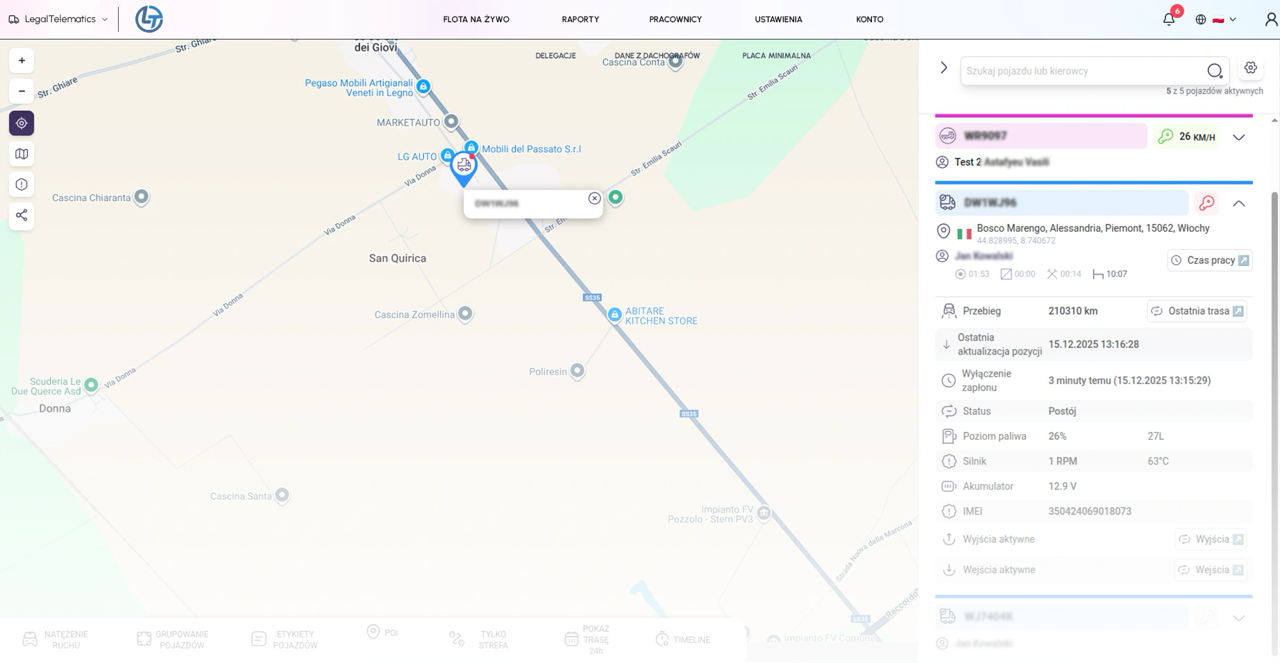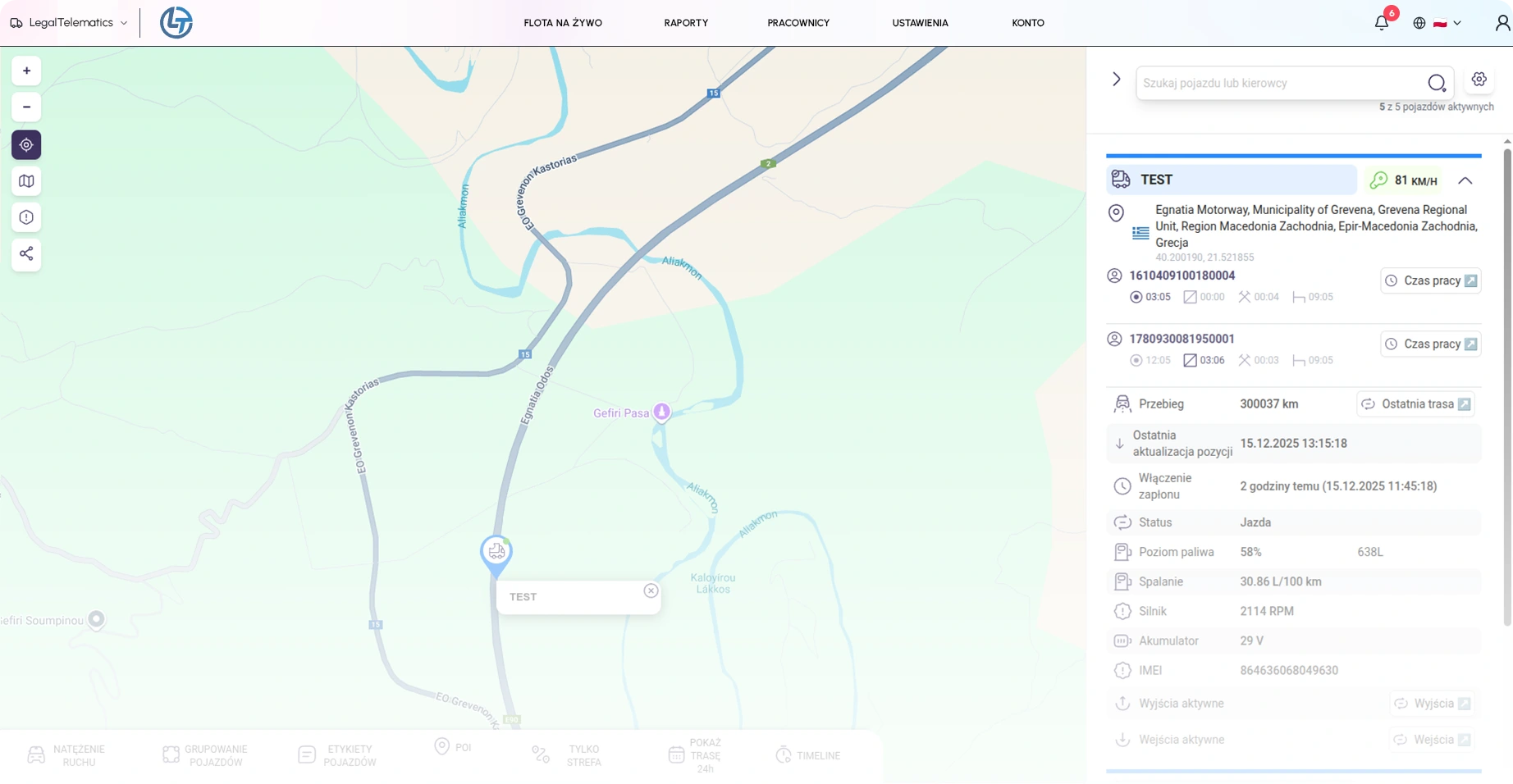 Telematyka w LegalTrans.ai łączy lokalizację GPS, dane z pojazdu (CAN/FMS), tachograf, naczepy i kierowców w jeden spójny obraz floty. System na żywo pokazuje, gdzie są pojazdy, ile czasu jazdy zostało kierowcy, ile naprawdę spalasz paliwa i jakie ryzyka pojawiają się na trasie. Dzięki ścisłej integracji z TMS i modułem rozliczania czasu pracy kierowców masz nie tylko monitoring, ale konkretne liczby: koszt frachtu, styl jazdy, zgodność z przepisami i stan techniczny pojazdów.