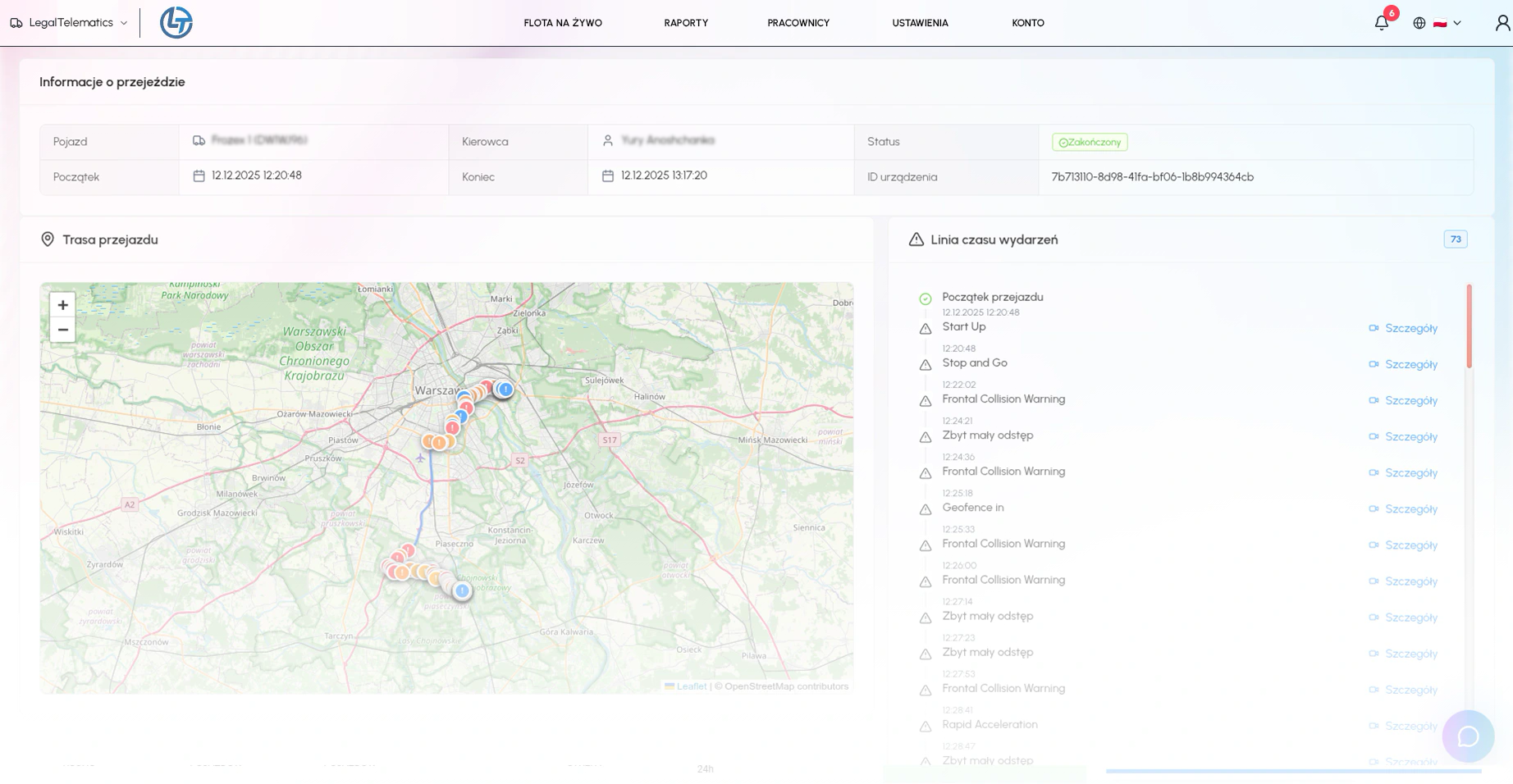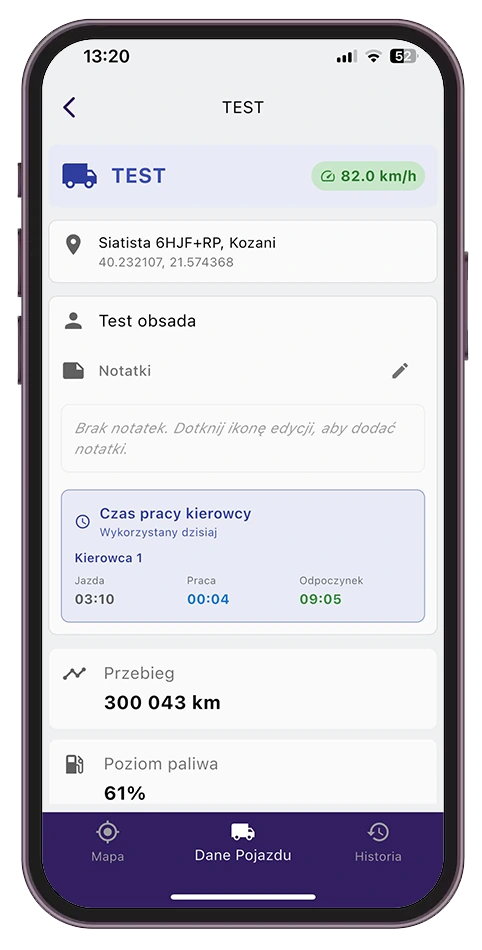 Mapa to nie tylko ikony pojazdów. Widzisz aktualną pozycję, historię tras, geofencing oraz wizualizację wykorzystania czasu jazdy, pracy i odpoczynku zalogowanego kierowcy.