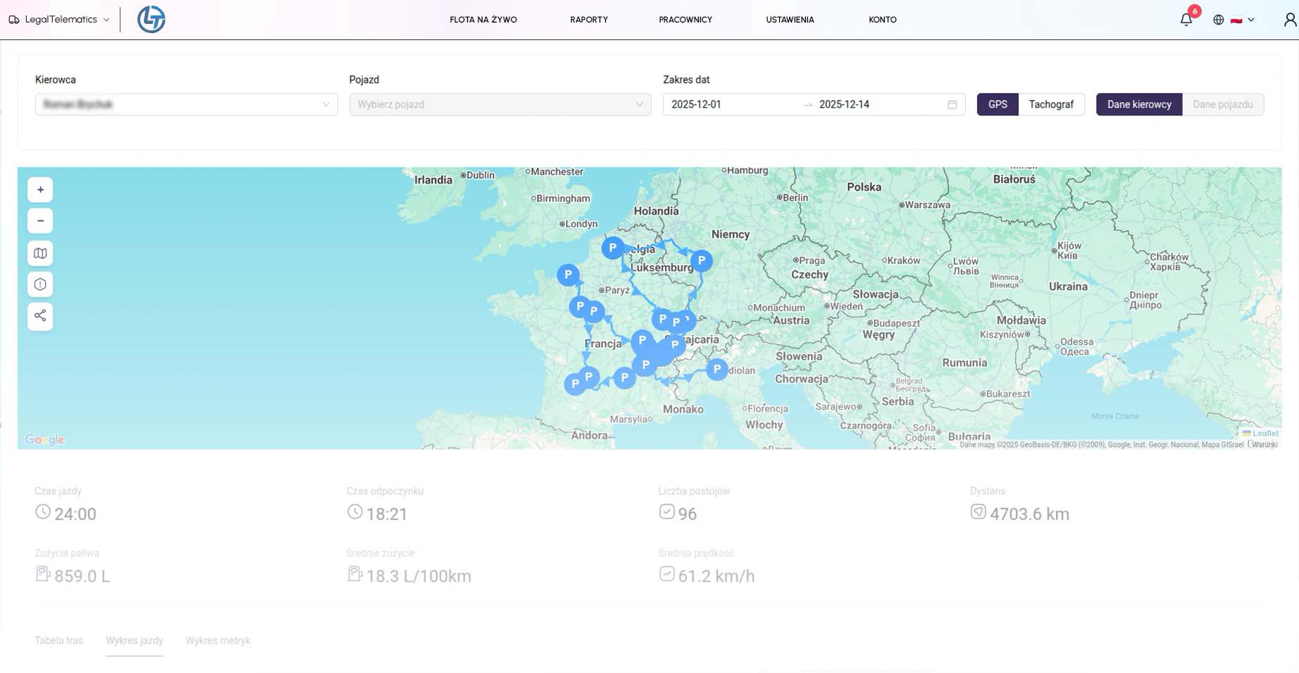 GPS na żywo z podglądem czasu jazdy, pracy i odpoczynku